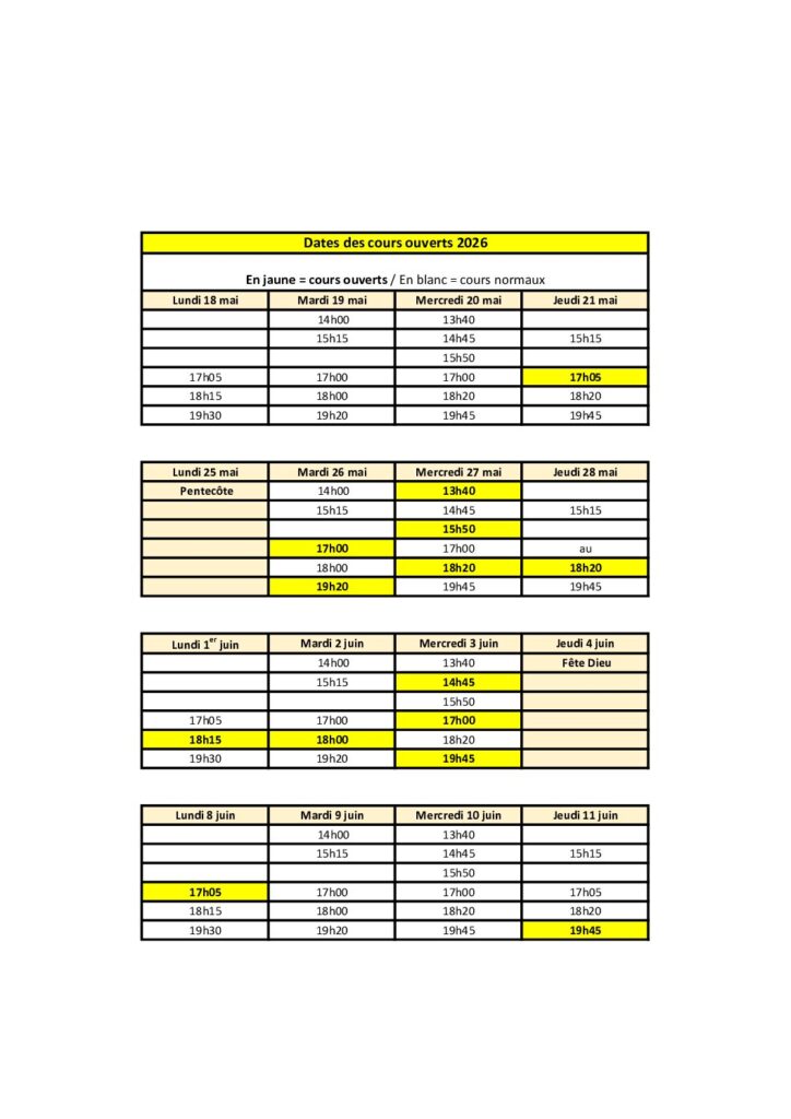 Programme et horaires des cours 2026/2027 normalement identique à cette année.